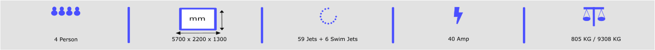 The Poseidon Swim Spa is designed for 4 persons, comprising spa and swim functionality. The Spa end of the Poseidon has 1 lounger and 3 seated positions.
