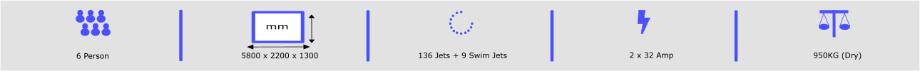 The Neptune Swim Spa is designed for up to 6 persons, comprising spa and swim functionality. The hot tub area has 1 lounger and 3 seated positions, with a further 2 seats in the swim area.